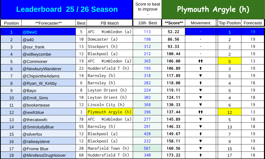 Entries close for the main competition if once I or @railwaybeth (my daughter) make a post after both clubs have declared a sell out. Any entries after that will be entered on the match spreadsheet but will not count in the season long competition.