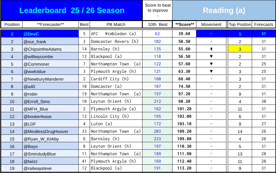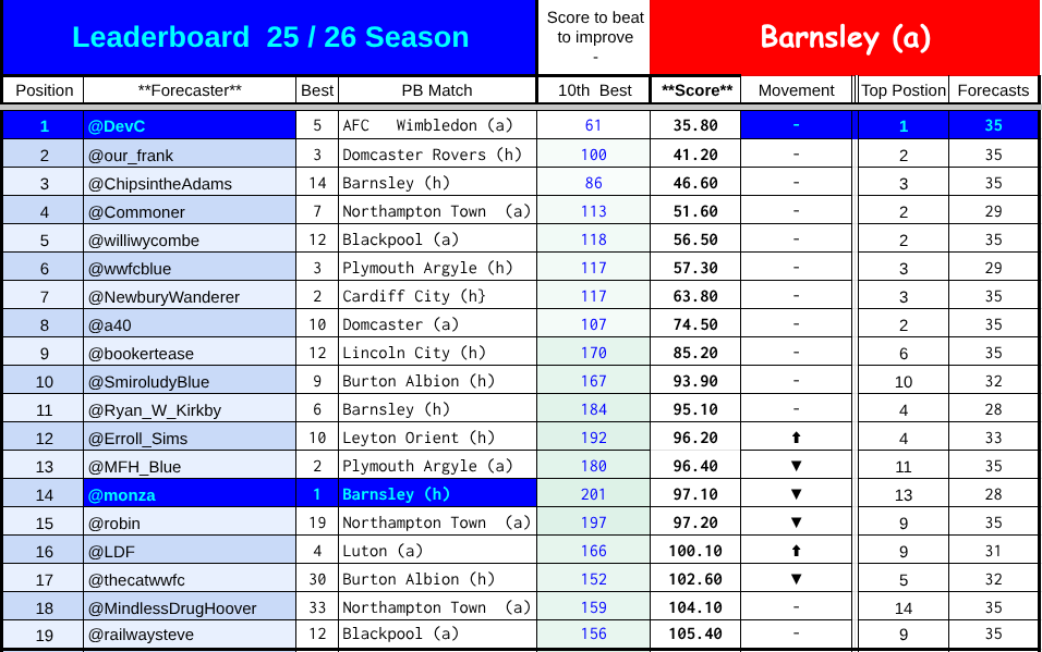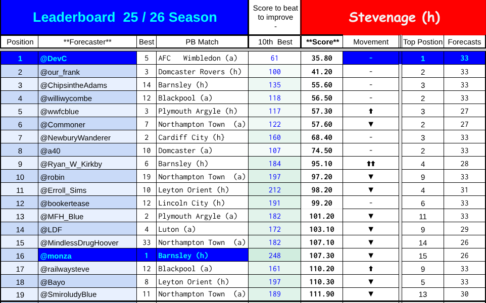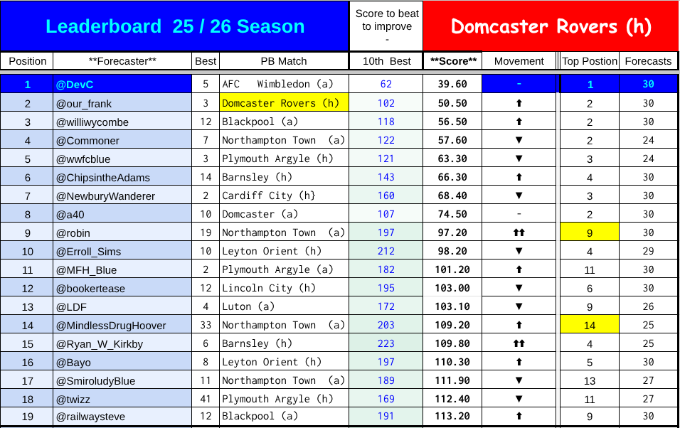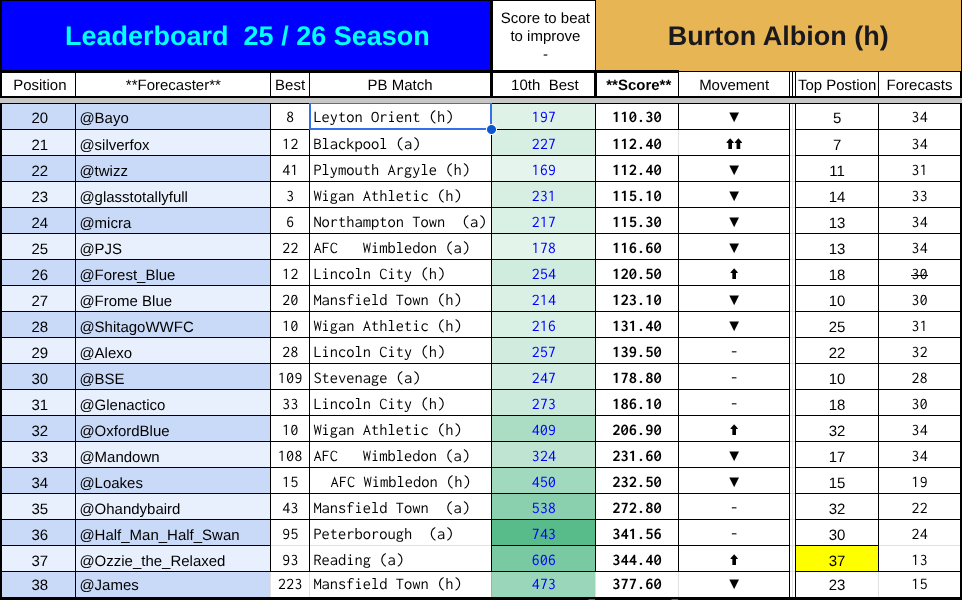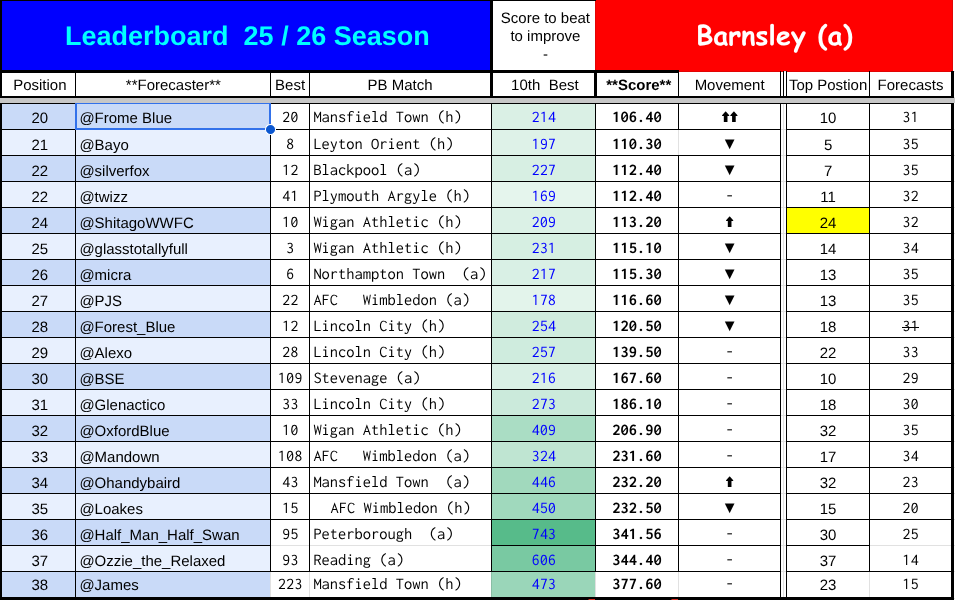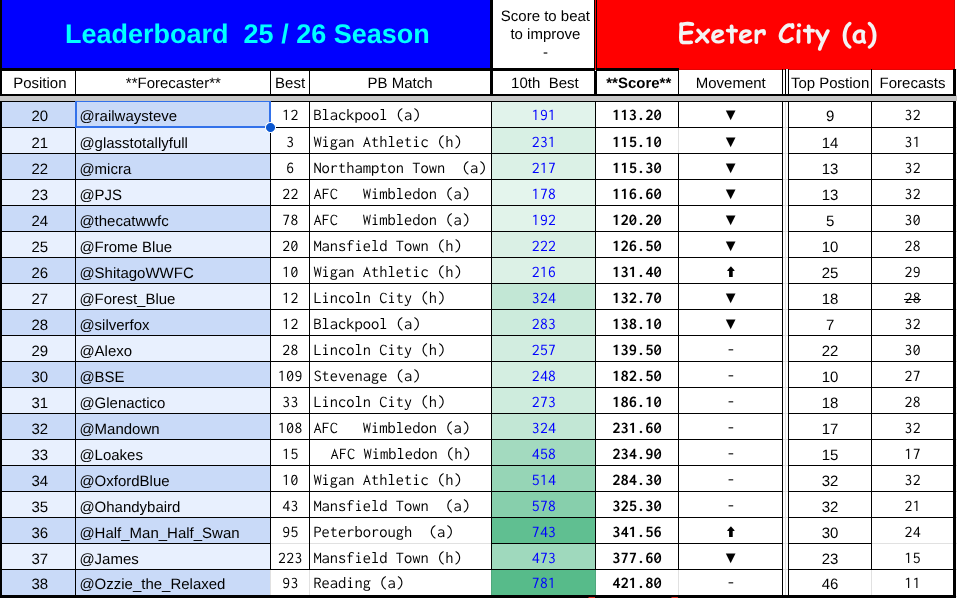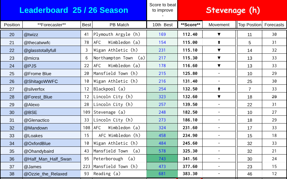 The affected scores for the Stockport game are highghted in pale red. Anyone who predicted the first game of the season and whose handle is earlier in the alphabet has an unaffected score.