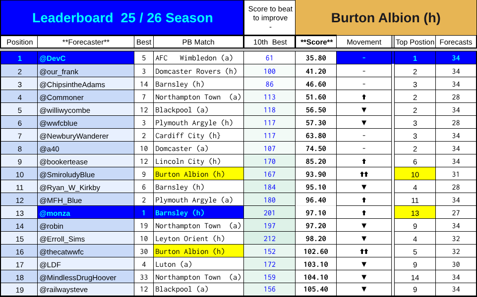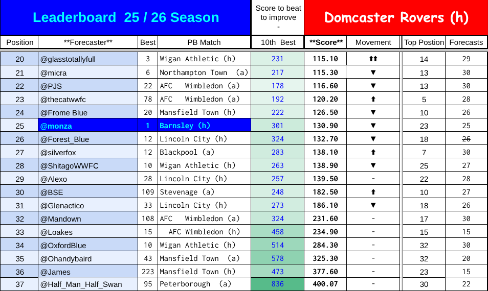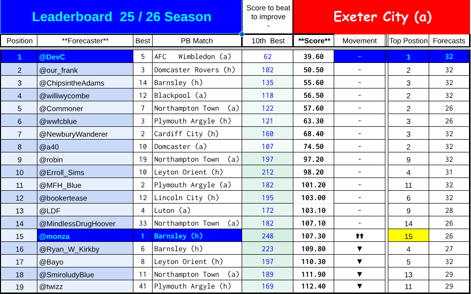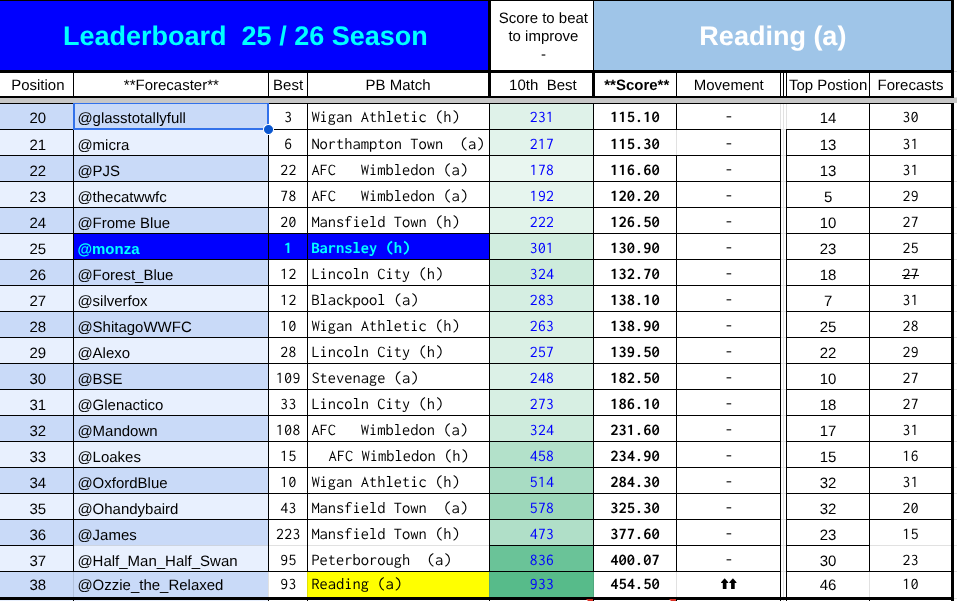 The mistake that I feel worst about is that @FromeBlue was credited with a score of 57 which should have belonged to @Monza = if I had been sharper I would have spotted this because @FromeBlue didn’t predict until the 4th match.
