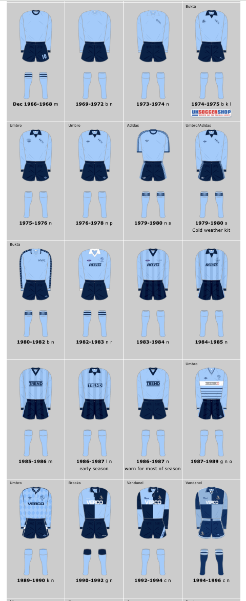 I started watching Wycombe in 1967 (hence my nom de plume) at that time our change kit was red shirts, white shorts and red socks, around 1972 we changed to yellow shirts, blue shorts and yellow socks. I believe occasionally we also wore white shirts as a change (if you look at the footage of the famous Uganda game it looks as though we are playing in white on that occasion) I don’t think we ever had quarters as a change kit until we used the fabulous red and white quarters at various times from the 90s and yellow and blue quarters which we used once in the 1990s under John Gregory and of course, the famous Ukraine kit of a few years ago .