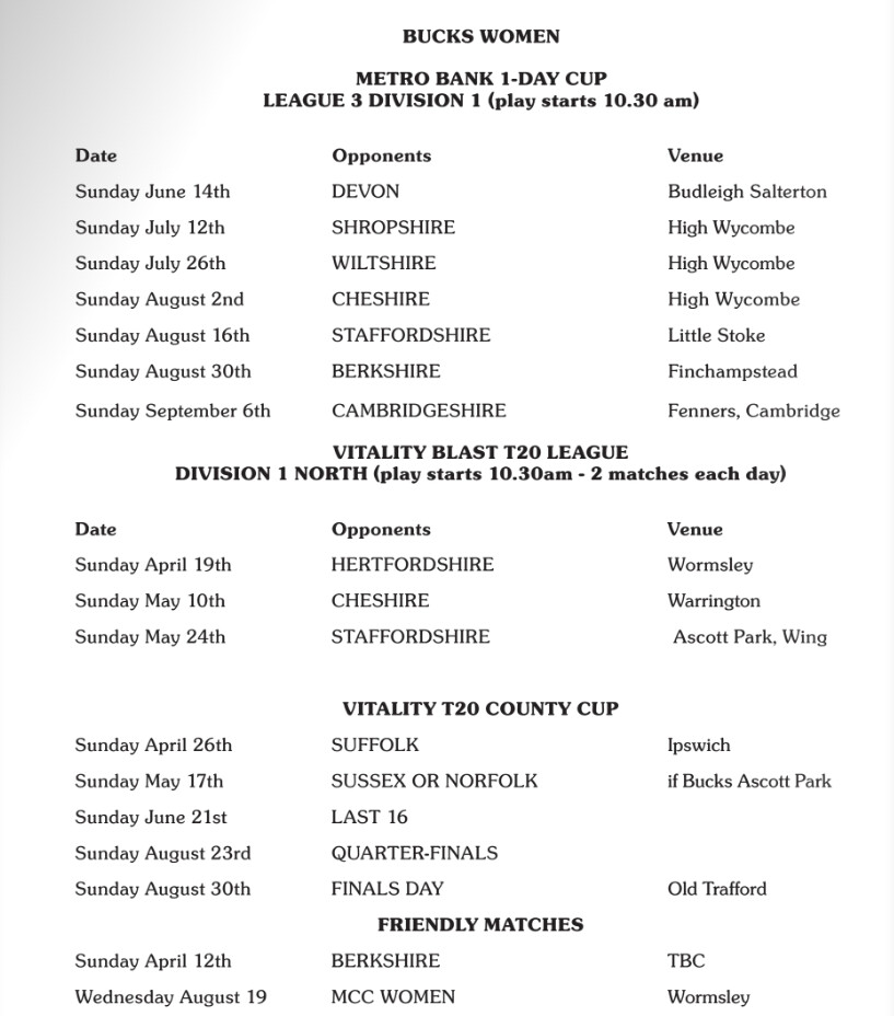 Batter Matt Pardoe joins, a former Worcestershire pro and captain of Herefordshire for 10 years. He teaches Geography at the RGS, where he is the cricket coach, and he will be playing for High Wycombe CC this season. Also joining are Bertie Foreman, an off-spinning all-rounder who spent three years at Sussex and had a loan spell at Worcestershire last season, and Josh Lincoln, a seeming all-rounder who has played the last four years for Berkshire. He continues to play for High Wycombe with his wicketkeeper brother Dan, who has departed Berkshire as captain and signed for Staffordshire. Talented Northants 2nd XI batter Aadi Sharma will continue to play for Bucks this season.