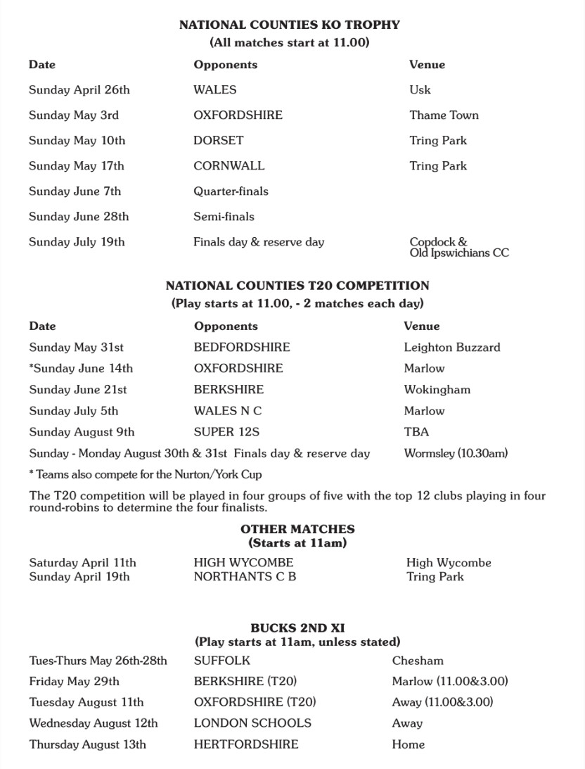 The First Class Counties are already three weeks into the season but the National Counties start their competitive season tomorrow, in the 50 Overs Trophy. Bucks Men begin with a trip to Usk, Monmouthshire, where they will face Wales.