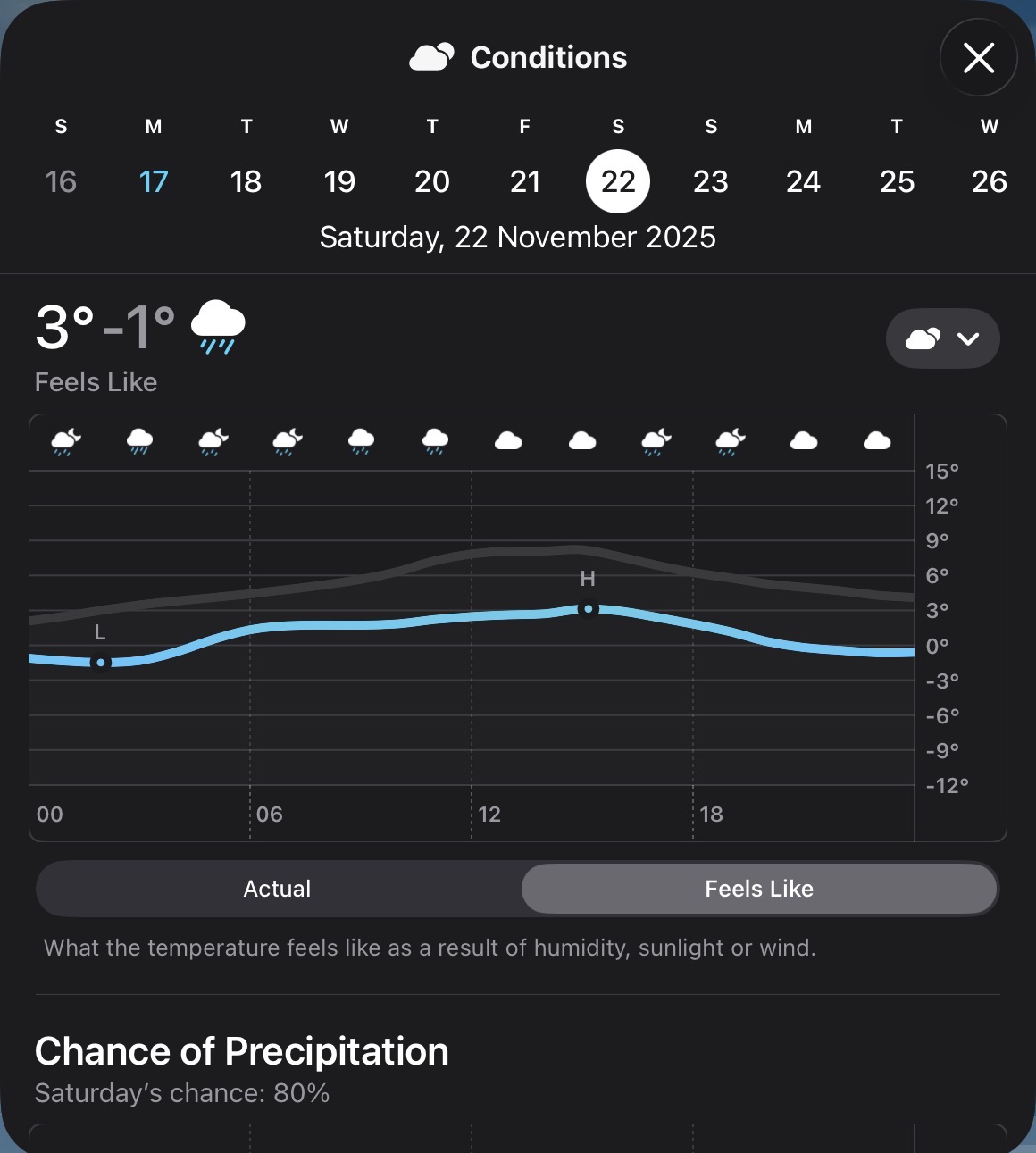 I certainly wouldn’t trust the meteorologists who arrived at that prediction. It had been widely anticipated for several days that the cold snap would end around Friday or Saturday and would be followed by milder weather. That projection shows the temperature falling to zero on Saturday evening when in fact it now looks as if it will be about 6 or 7 degrees Celsius at midnight and staying at that level through the night.