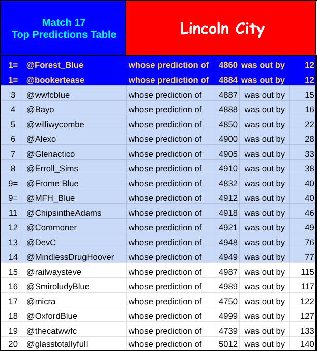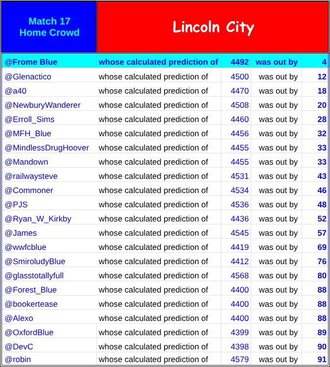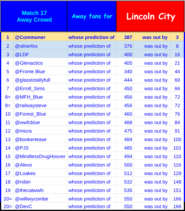 Congratulations to a further ten Forecasters who were all within one hundred - @williwycombe; @Alexo; @Glenactico; @Erroll_Sims; @FromeBlue; @MFHBlue; @ChipsintheAdams @Commoner’; @DevC and @MindlessDrugHoover.