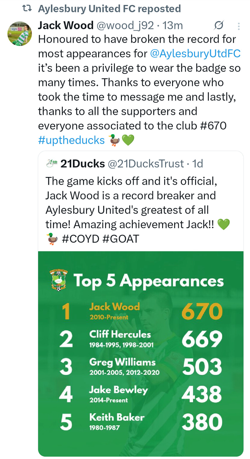 Congratulations to Jack Wood for becoming Aylesbury United’s record appearance holder. A record like that is rare these days. He is a very good player and could have played at a higher level but, sometimes, loyalty is more important.