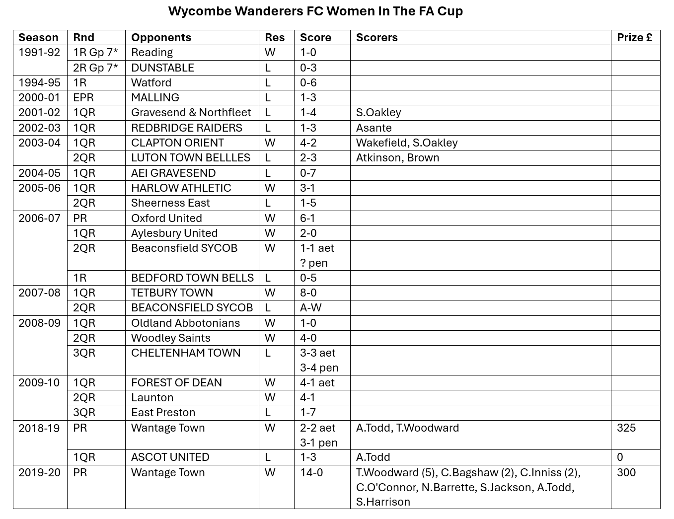 I noticed last week that the chairboys.co.uk section on WW Ladies, from 2000-05, included FA Cup results. When they entered in 2018, I remember the Club, or the Trust, saying it was the first time the club had entered. I took that at face value but should have checked because all FA Cup results are now available on Wiki. I will gather up the extra results and produce a new list, in the next day or so.