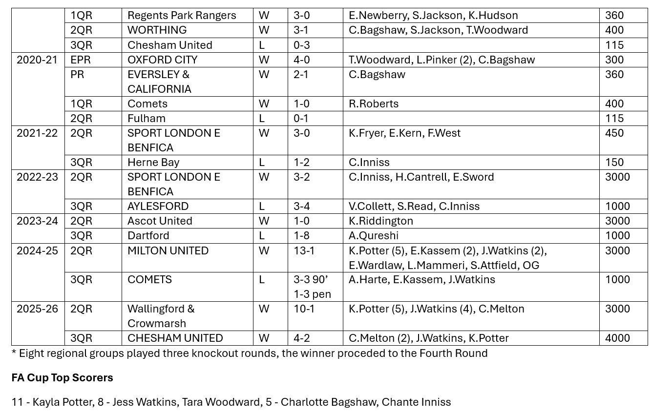 After some further digging today on the FA Cup Wikipedia pages, Women’s F.A. Cup - Results and chairboys.co.uk, this is what I believe is the full history of W3 in the FA Cup. They started way before 2018!