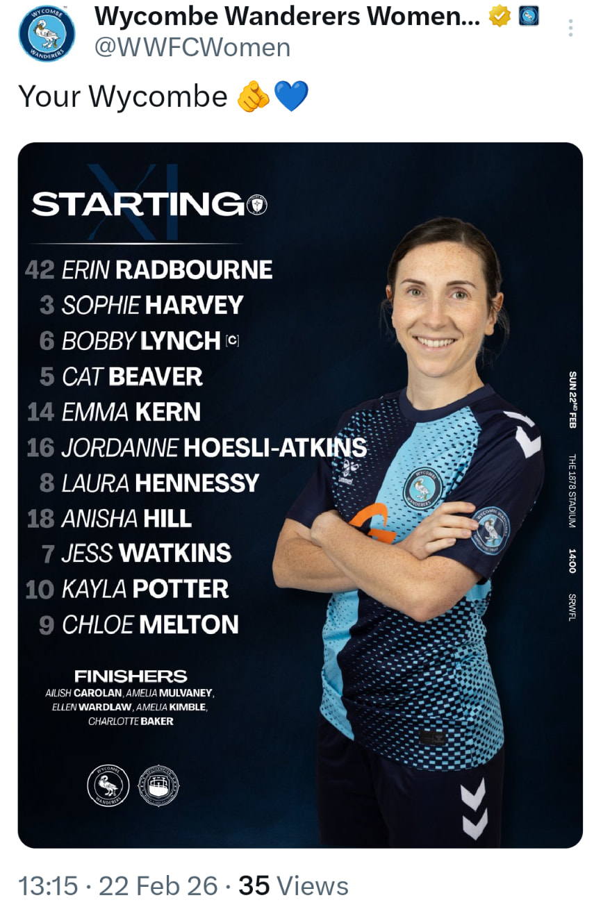 Top scorer is ex-Chairgirl Chloe Ball with all of her 10 goals from 11 league games. She was captain of the Wycombe Wanderers Development team, made her first team debut for us aged 17 in 2018-19, and is a highly rated striker at this level. Ball was twice on target against the Rams last week. That game saw the return of goalkeeper Grace Jenman to the club. Six players who made 10 or more appearances last season are playing this season.
