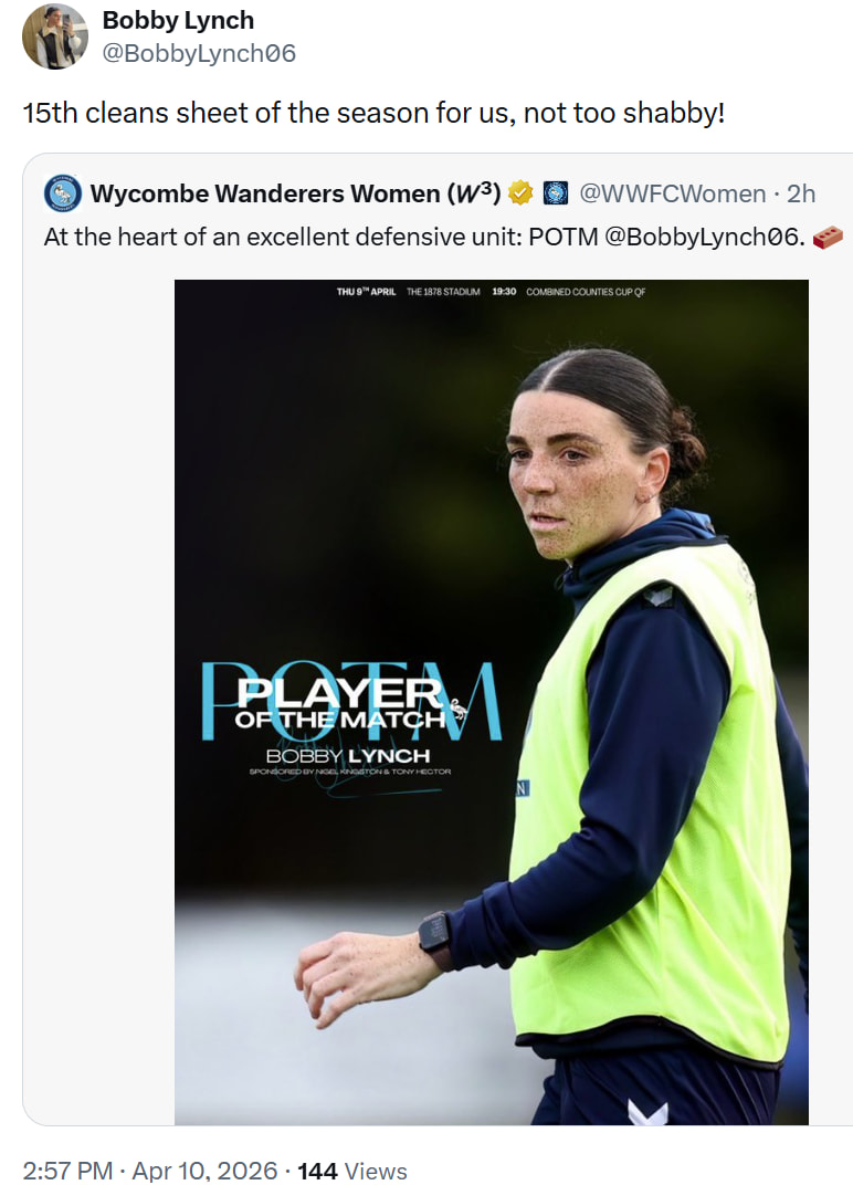 FT WW 1-0 Watford, very entertaining match, especially after the break when our HT subs made a big difference. Axe made some crucial saves, Melton’s class proved the difference. Watford played some nice football, I can see why they are holding their own at tier 5. Their speedy forwards were a constant threat.