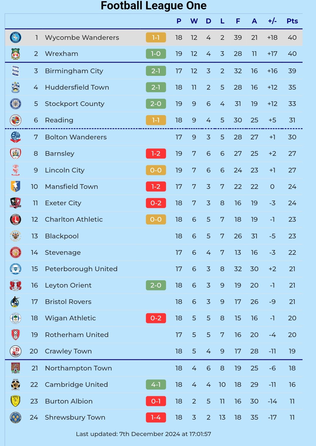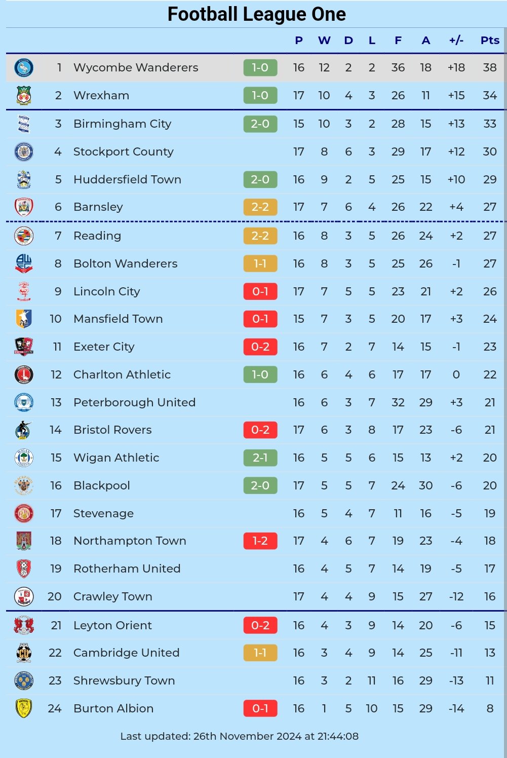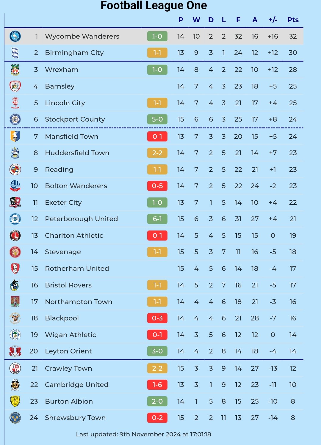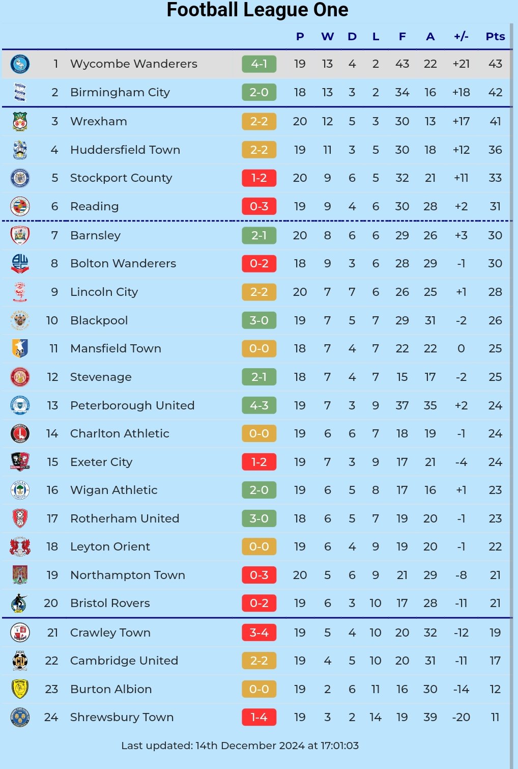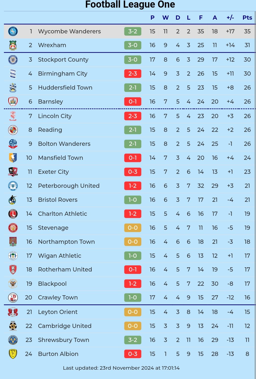 - Chairboys remain top of League One, one point ahead of Wrexham and two points ahead of Birmingham City.