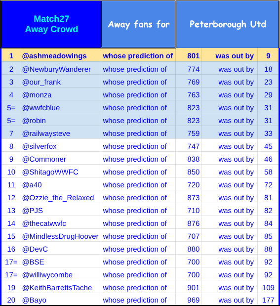 Congratulations to @NewburyWanderer; @our_frank; @Monza; @wwfcblue and @Robin, plus myself - we were all within 5% [39.6] of the away support .