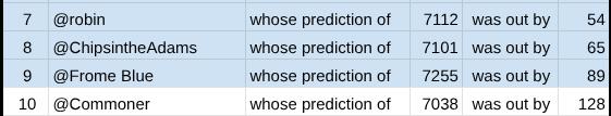 Many congratulations to @MFHBlue, not only the closest but the only forecaster to be closer than @DevC! Forecaster of the Week on a difficult week to predict.